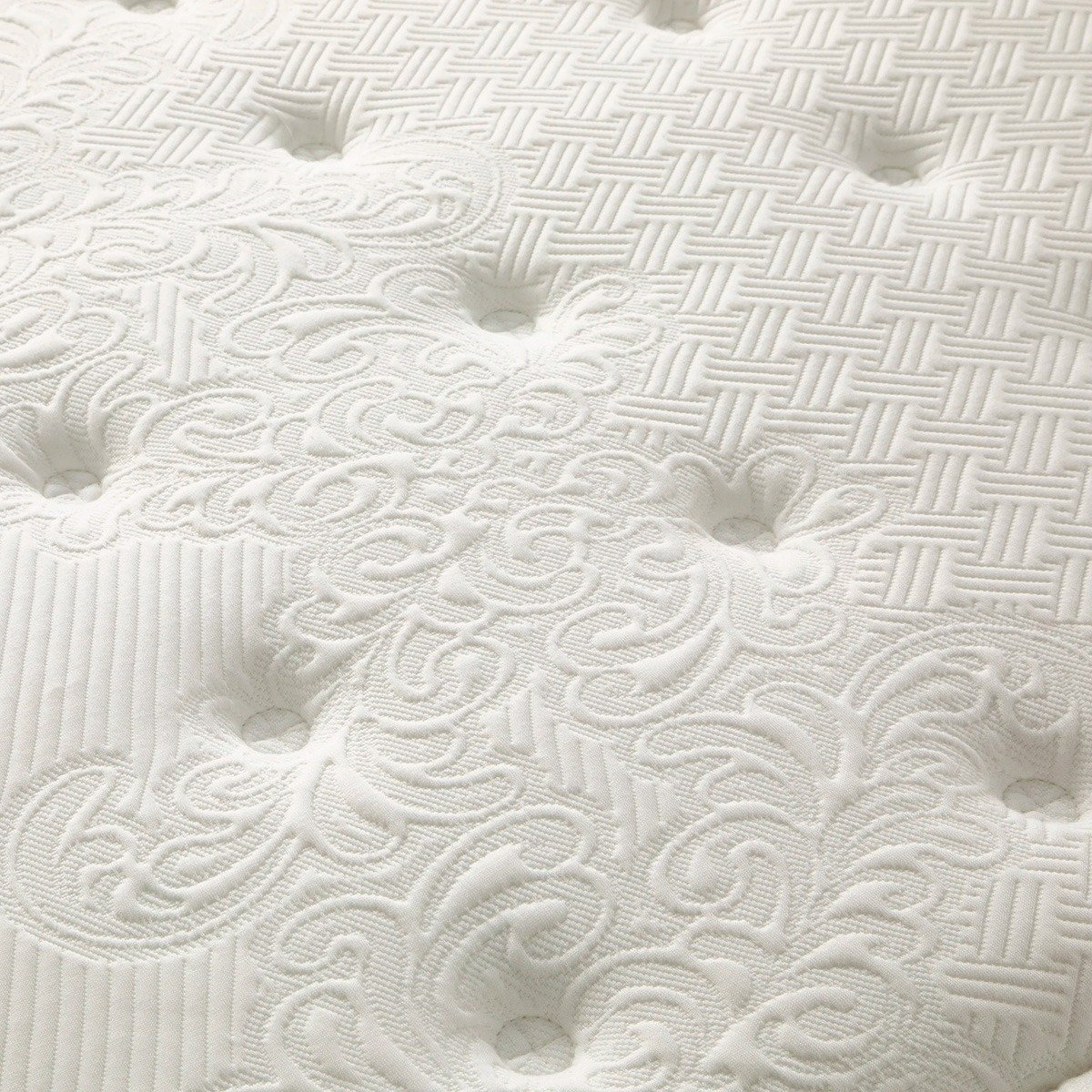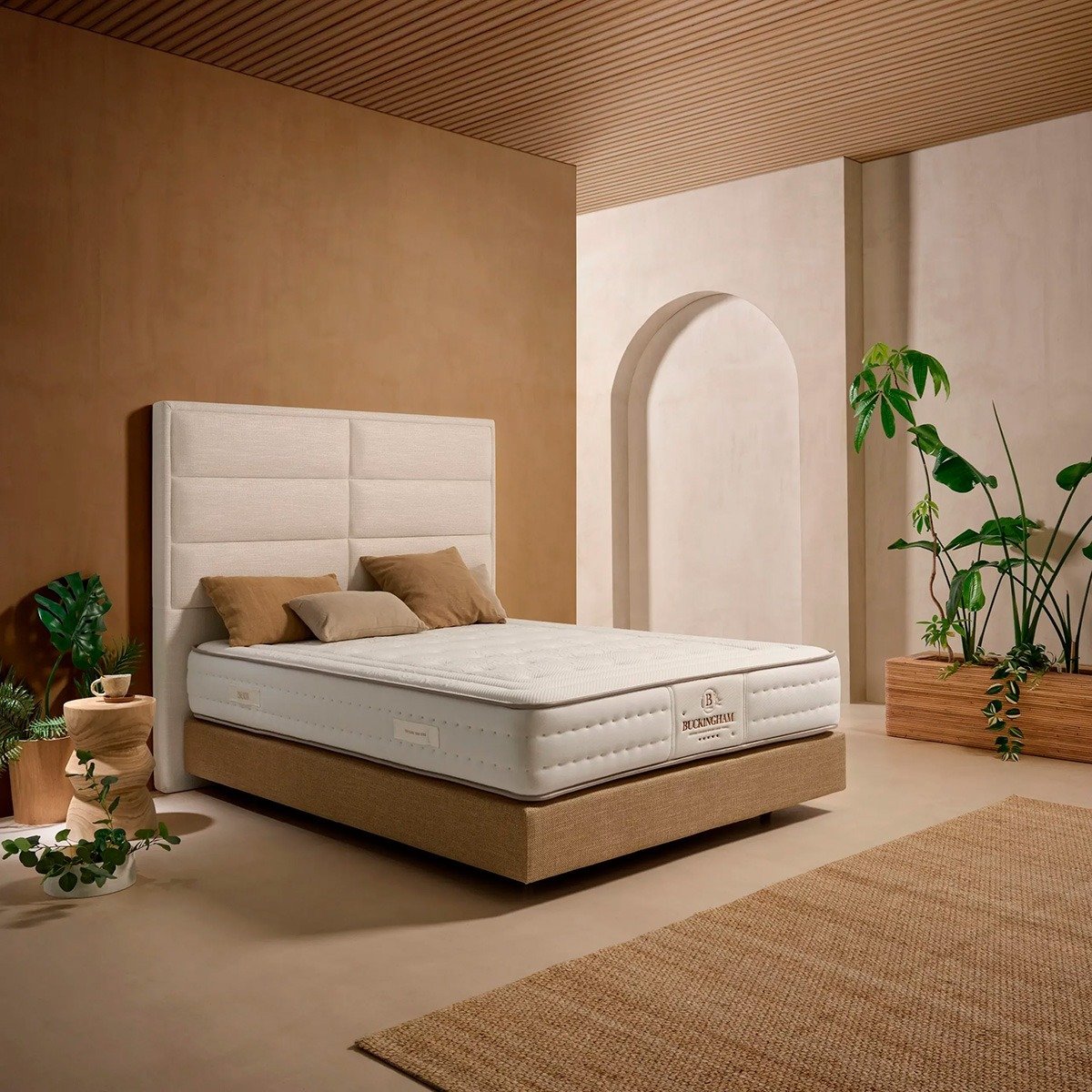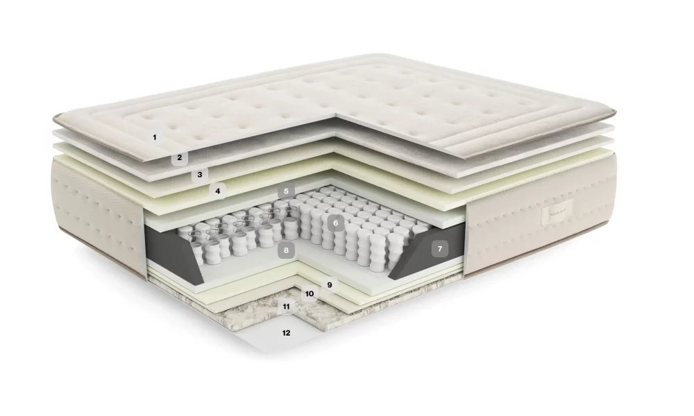Colchón de muelles ensacados y viscoelástica con relleno de tejidos naturales: algodón y lana. Disfruta del confort natural con el colchón Buckingham, diseñado con algodón y lana Merino para una transpirabilidad perfecta en cada estación.