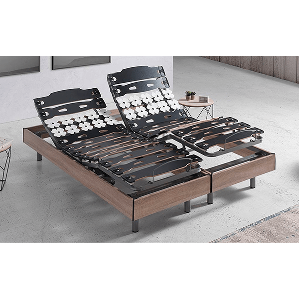 Cama articulada eléctrica con somier reforzado y juego de patas metálicas. Lecho en tubo de acero y lamas en madera de haya. Mando inalámbrico.